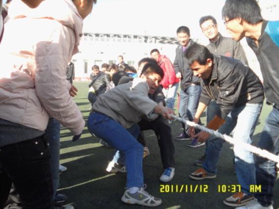 2011年11月12号信息工程学院自动化党支部11组在足球场上举办了拔河比赛活动,比赛现场喊声如雷、热火朝天;本次活动意在提高同学们身体素质,增强新生与党员之间的互动与交流,最后靳老师对本次活动作了总结,刘丕亮老师颁发了前两名荣誉证书。