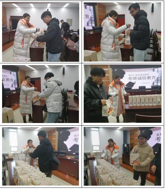 活动最后,学院精心为每位考生准备了充满关怀与温暖的考研加油包。这个加油包里装满了寓意美好的物品,“橙”意满满,“苹”安顺遂,妙笔生花。祝愿全体考研学子一“研”为定,成功上岸!
